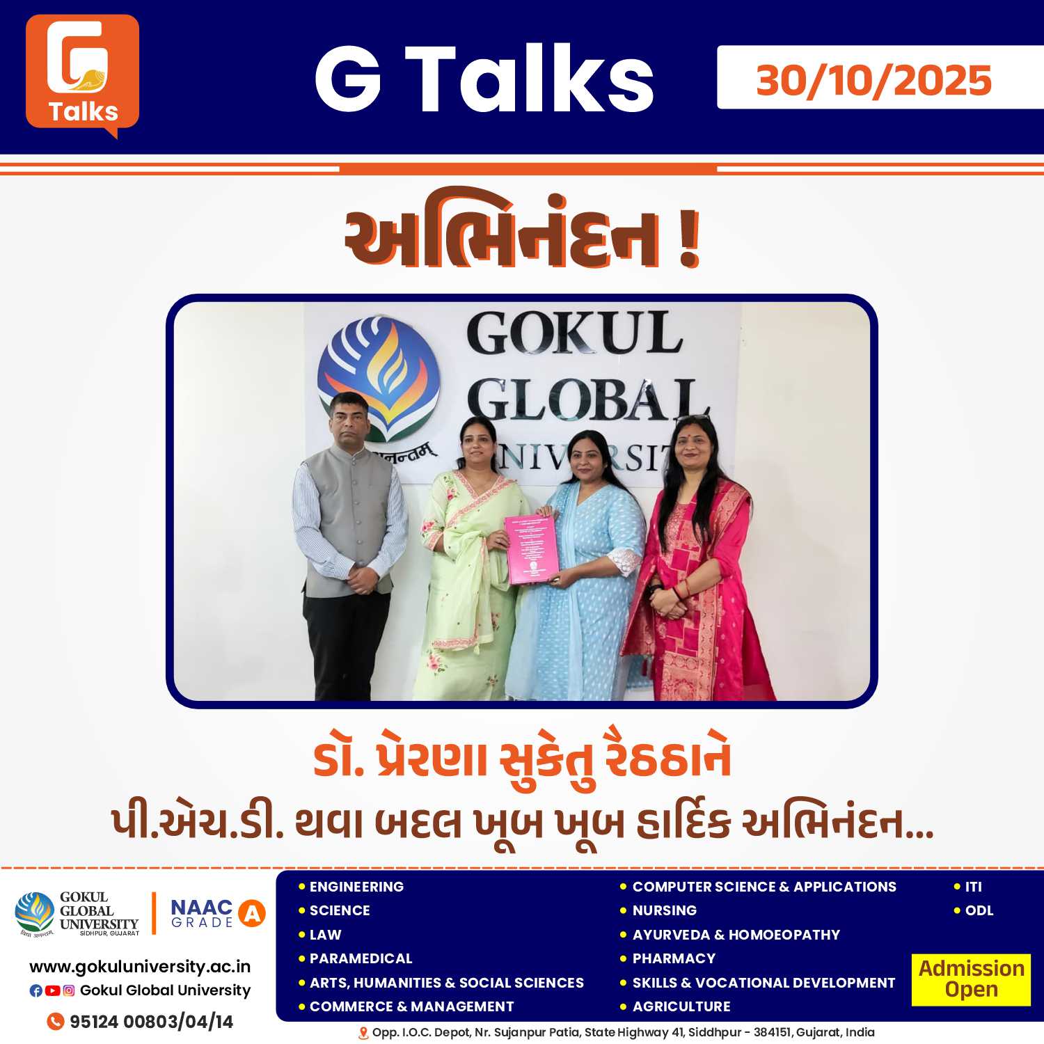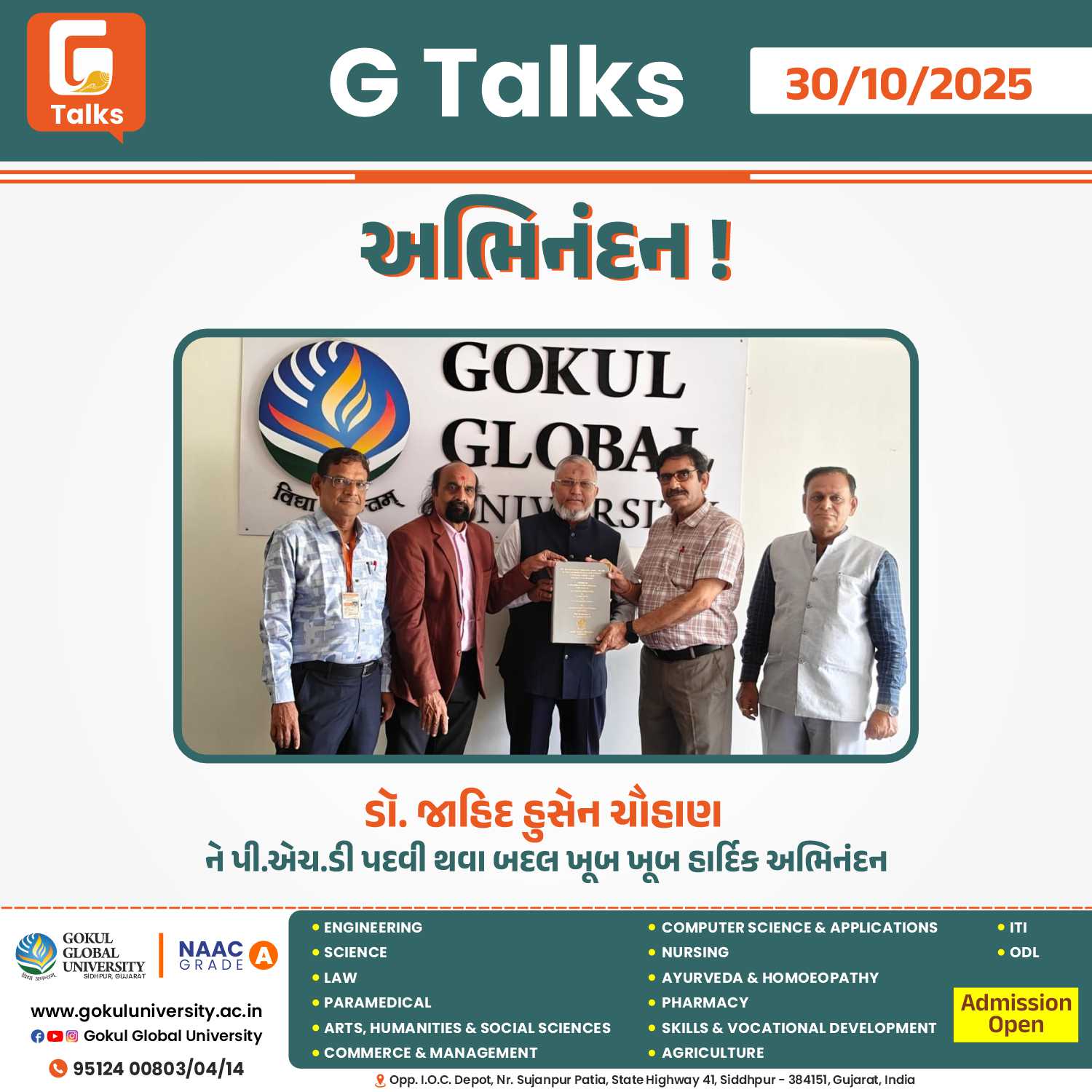 ગોકુલ ગ્લોબલ યુનિવર્સિટીના ઇજનેરી વિભાગમાં ડૉ. દેવાંગ અશોકકુમાર ઠાકરએ પીએચ.ડી. થિસિસ સફળતાપૂર્વક પૂર્ણ કર્યું છે.